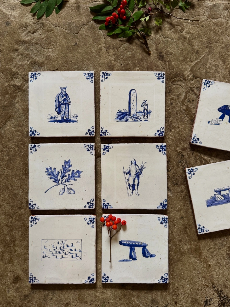 These designs blend the classic beauty blue-and-white of Dutch Delftware with the folk revival. Fired on our terracotta‑toned rustic base, these tiles suit kitchens and bathrooms, look beautiful framed, and make fine gifts or small votive offerings to deep time.
